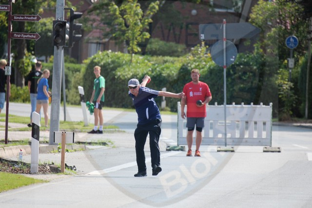 Weiter gehts mit den Männern. Hier eröffneten unsere Blomberger Urgesteine Frank Freese und Ingolf Eiben den Cup. Auch hier waren einige Championstour-Teilnehmer/Landesliga-Werfer vertreten. Alle wollten mittels verschiedenster Techniken die weitesten Würfe erzielen. Insbesondere bei den Männern fiel es auf, dass sie versuchten, die Gummikugel über die Hindernisse springen zu lassen. Manchmal gelang dies, manchmal eher nicht. Am besten kamen in Runde 1 Andre Backer & Andre Emkes auf der Parcour-Straße zurecht. Mit neuer Tagesbestweite von 6 Wurf und 11 Metern gingen sie übers Ziel. Steffen Janssen & Arno Thiele folgten mit 7 Wurf und 127 Metern, gefolgt von Marcel Brunken & Ludger Ruch mit 7 Wurf und 30 Metern.